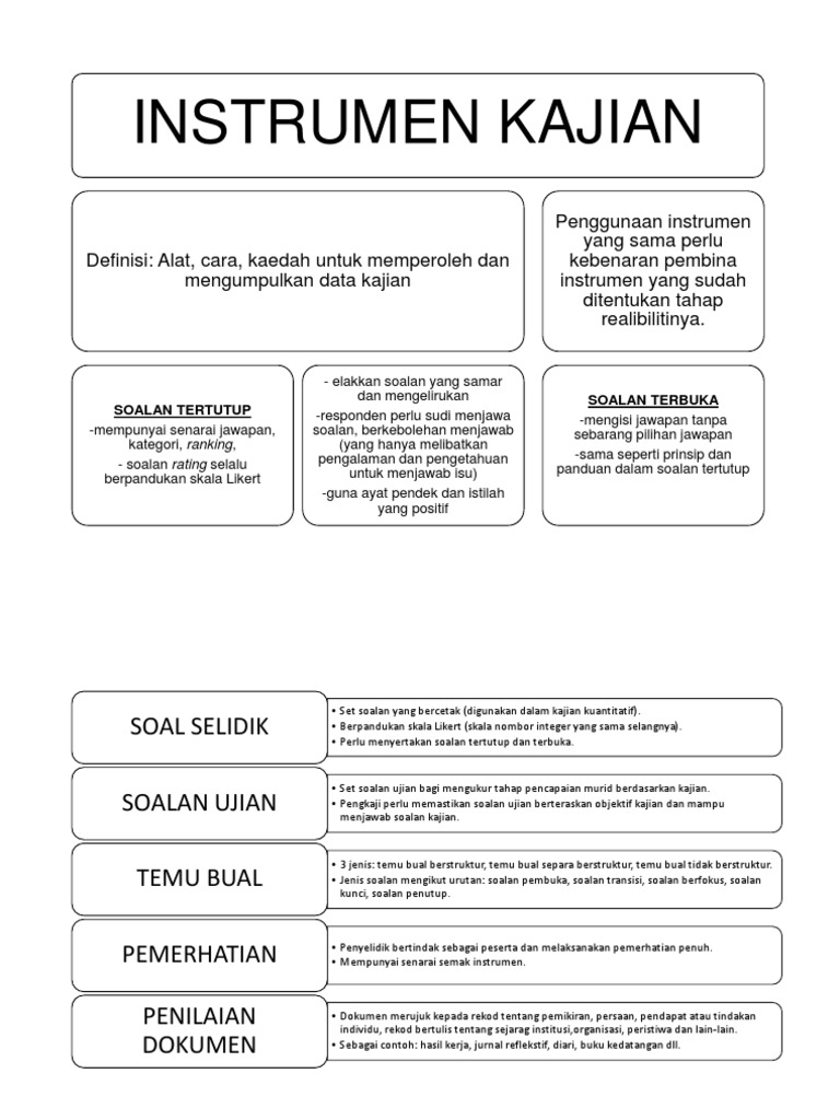 Berikut ini bermacam-macam bentuk instrumen penelitian diantaranya. Ia juga berfungsi sebagai panduan dalam membantu penyelidik dalam proses memungut menganalisis dan membuat pentafsiran hasil daripada penyelidikan yang dijalankan. Setelah menemukan solusi berupa teori selanjutnya disusunlah indikator-indikator berdasarkan solusi tersebut.